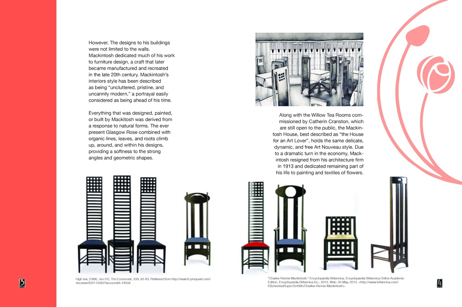 I tried a few different things today after critique. The idea of putting Mackintosh's wallpaper pattern on the inside cover intrigued me, so I gave it a try on the title page and table of contents.